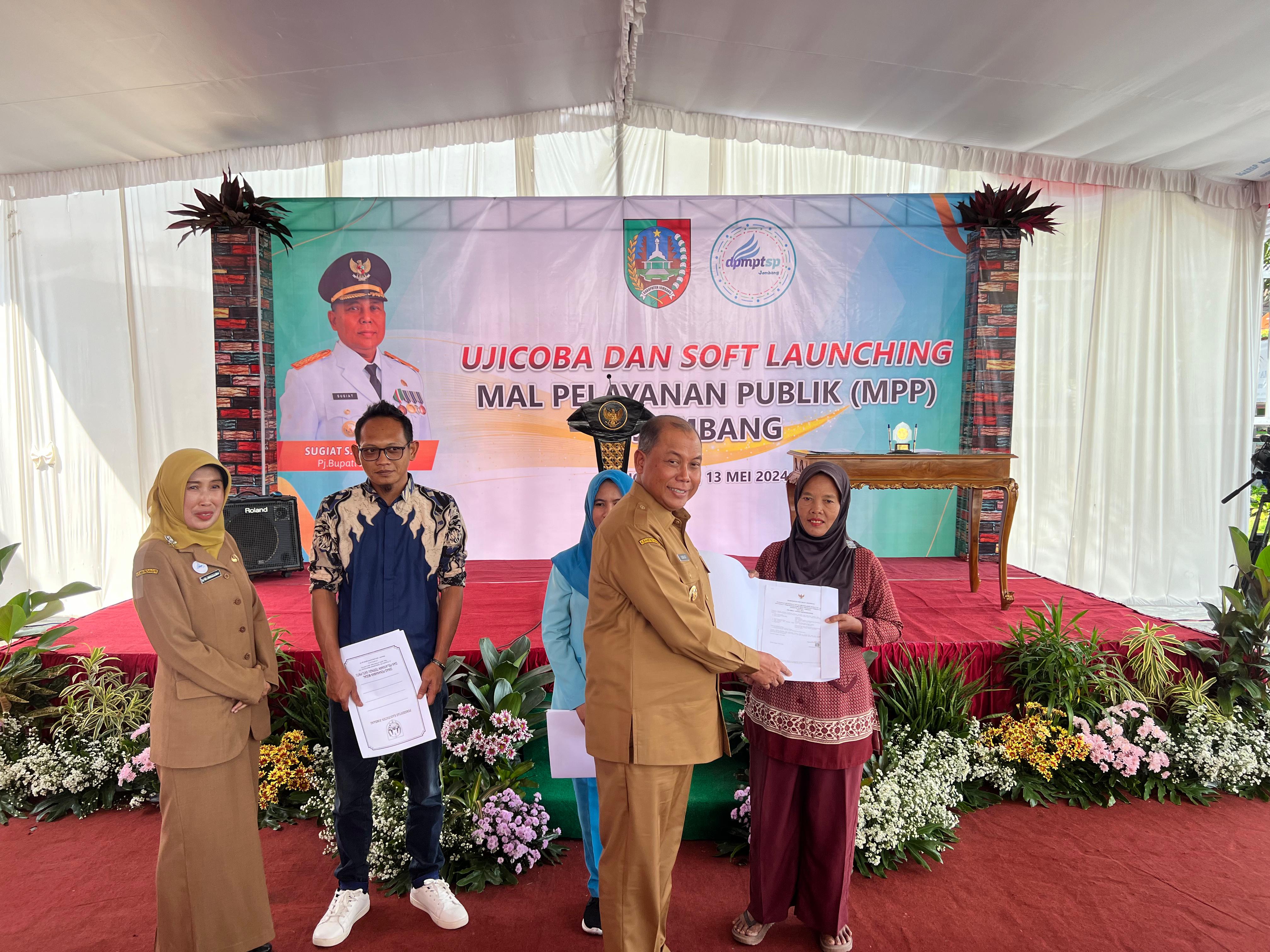 Pemerintah Kabupaten Jombang melakukan uji coba dan soft launching Mal Pelayanan Publik (MPP) yang bertempat di halaman Kantor Dinas Penanaman Modal Dan Pelayanan Terpadu Satu Pintu Kabupaten Jombang, Pj. Bupati Jombang Sugiat telah menandai proses Soft Launching Mal Pelayanan Publik (MPP) Kabupaten Jombang tersebut, pada Senin (13/5/2024). Pj Bupati Jombang Sugiat menyampaikan, pendirian MPP adalah langkah yang sangat penting dan sesuai dengan amanat Pasal 14 PermenPAN RB 92/2001 tentang Petunjuk Teknis Penyelenggaraan MPP.