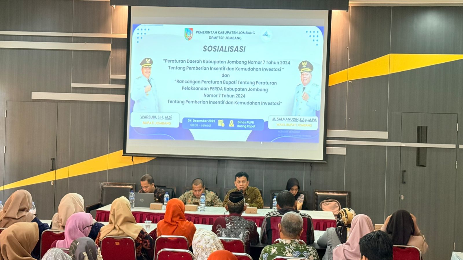 Jombang, 4 Desember 2025 – Pemerintah Kabupaten Jombang melalui Dinas Penanaman Modal dan PTSP Kabupaten Jombang menyelenggarakan sosialisasi Rancangan Peraturan Bupati (Perbup) mengenai pelaksanaan Peraturan Daerah Nomor 7 Tahun 2024 tentang pemberian insentif dan kemudahan investasi. Acara dibuka oleh Plt. Kepala Dinas Penanaman Modal dan PTSP Kabupaten Jombang yang dalam hal ini diwakili oleh Koordinator Bidang Perencanaan, Pengembangan Kerjasama dan Promosi Penanaman Modal, Suwito, S.Sos., M.Si. Kegiatan yang berlangsung di Ruang Pertemuan Dinas PUPR ini dihadiri pelaku usaha, mikro/UMKM, perwakilan OPD teknis, serta menghadirkan narasumber dari Bagian Hukum Setdakab, Bappenda, dan akademisi Universitas Brawijaya Malang.